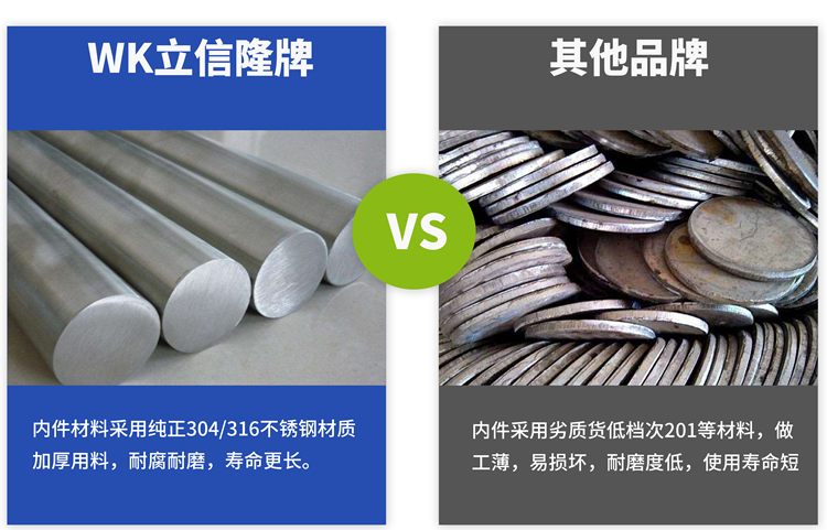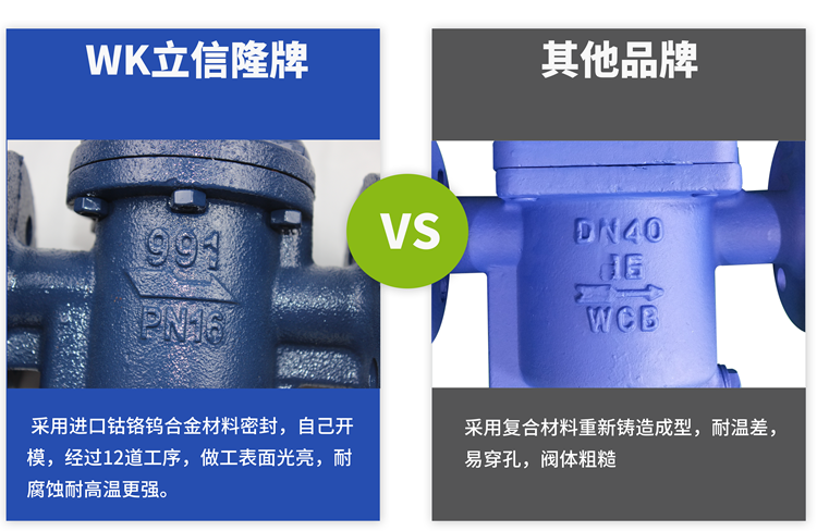 WK立信隆疏水閥內(nèi)件材料采用采用進口鈷鉻鎢合金材料密封,自己開模,經(jīng)過12道工序,做工表面光亮,耐腐蝕耐高溫更強。純正不銹鋼材質(zhì),加厚用料,耐腐耐磨,壽命更長。