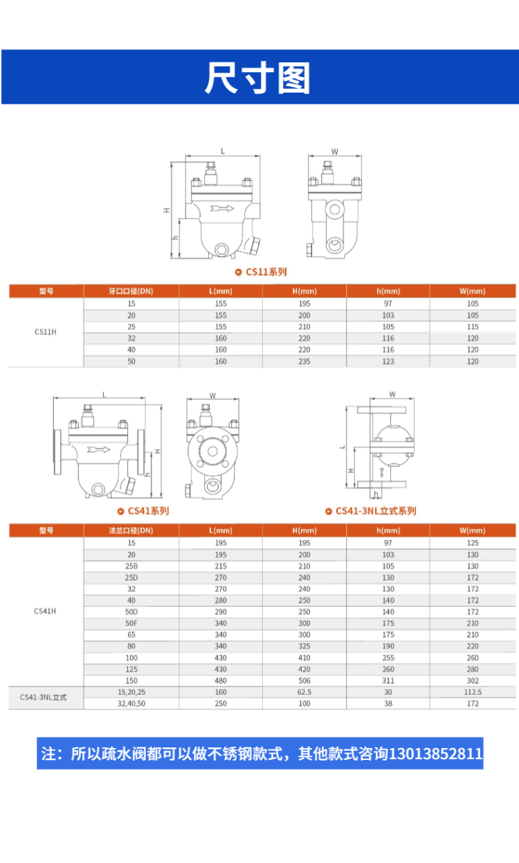 不銹鋼疏水閥,可制作WCB/304/316的材質(zhì)的閥門。自由浮球式不銹鋼疏水閥能快速排水,閥體加厚設(shè)計(jì)壽命長。廣泛使用在石油、化工、輕紡、印染、制藥、造紙、食品,等工礦企業(yè)。咨詢電話13013852811