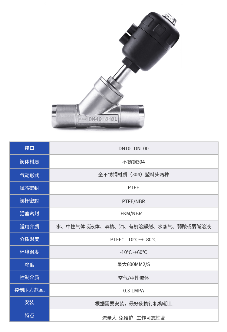 氣動形式采用全不銹鋼形式和塑料頭、鋁合金兩種。使用介質廣泛:水、中性氣體或液體,酒精,油,有機溶解劑,水蒸汽,弱堿或者弱酸。